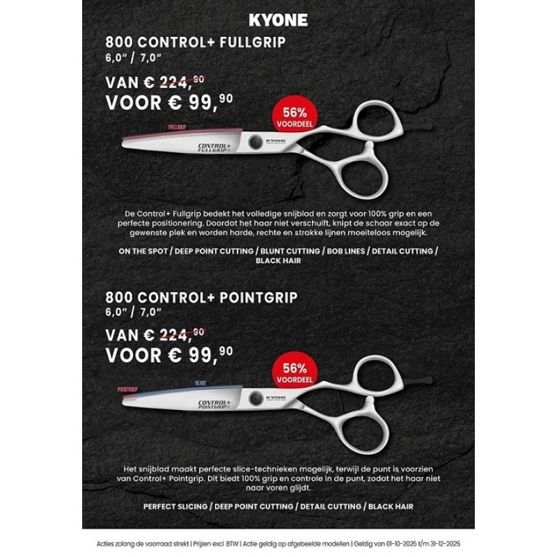 Een nieuwe generatie is aangebroken, namelijk CONTROL+ scharen. Wanneer je eenmaal met deze scharen hebt geknipt, wil je niets anders meer! Deze scharen zijn in twee uitvoeringen verkrijgbaar, namelijk Pointgrip (extra grip punt) en Fullgrip (extra grip gehele snijblad).
